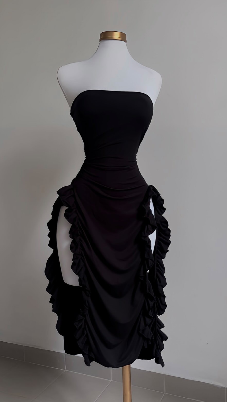 Black Strapless Ruffled Slit Satin Dress