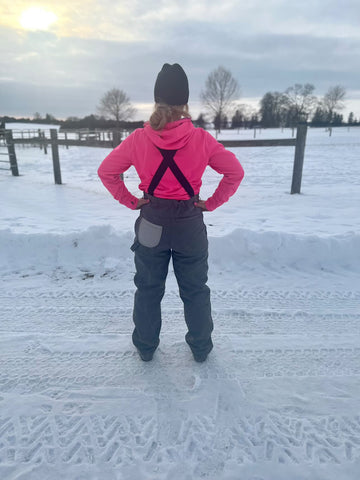 Renee is shown here wearing a size medium, insulated pair, in the long length. She is 5'7" and prefers the long length for riding. She typically wears size 28/29 jeans and a medium top.